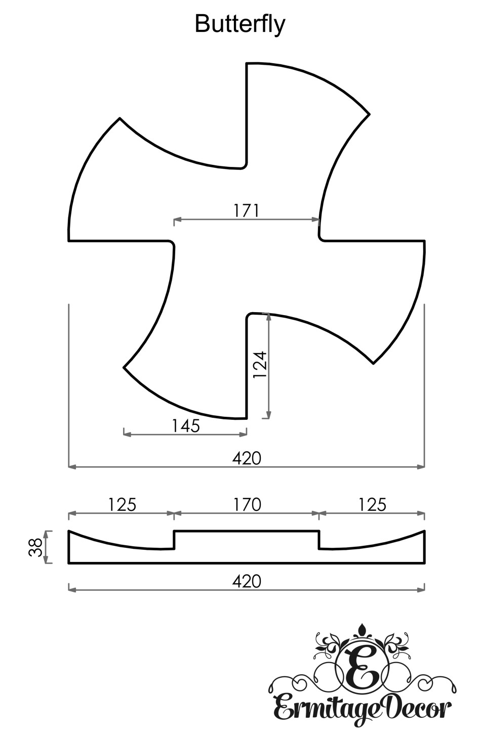 Панель модели Butterfly - это гипсовая 3d панель сечения в форме бабочки или спирали, с делением на четыре части, углы которых приподняты и расходятся от центра, центр же ниже краёв, получается блюдце. Таким образом создаётся бантик.