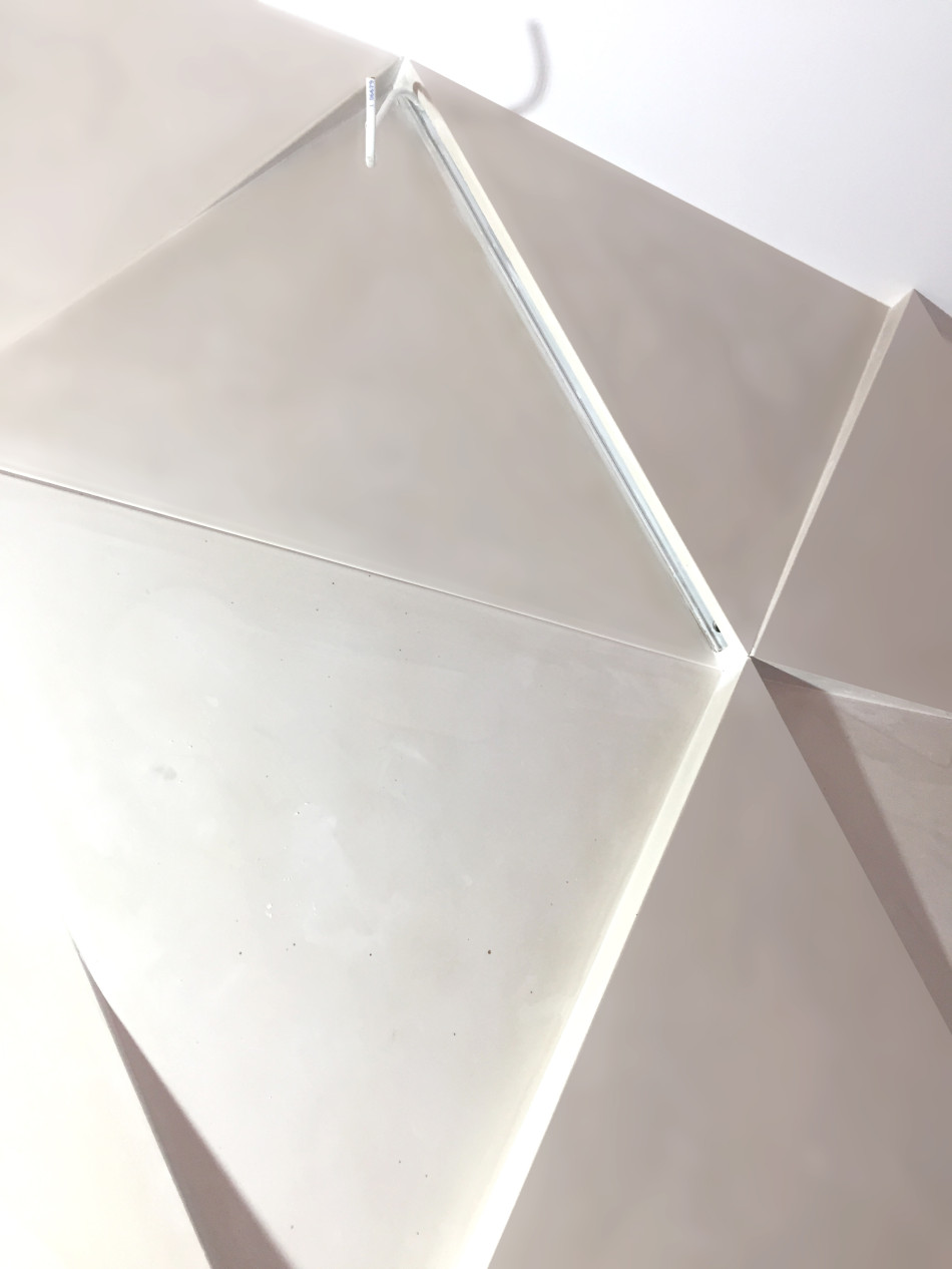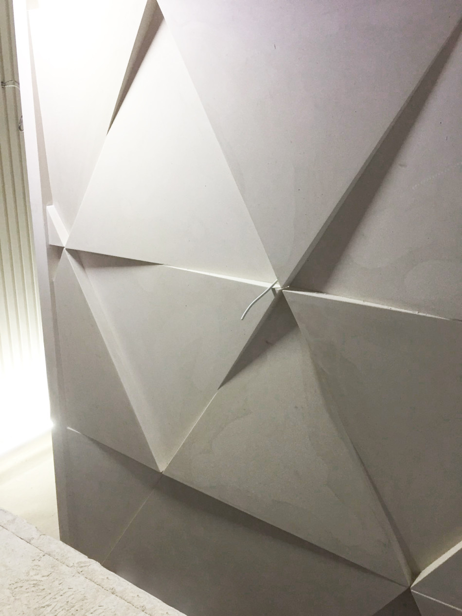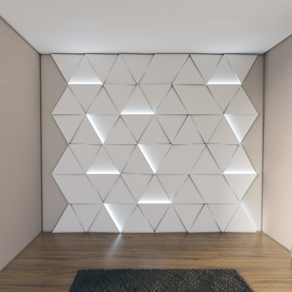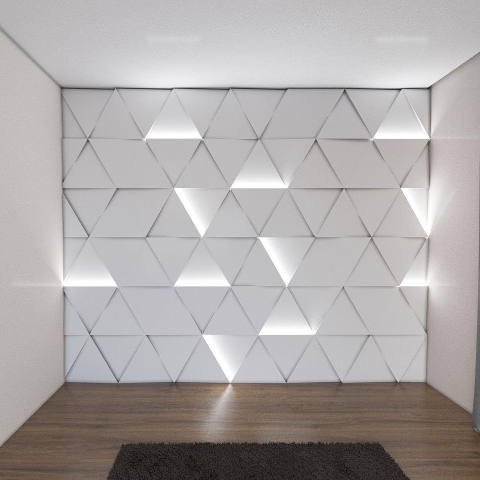 Форма панелей треугольная, с равными сторонами. Чередуя панели вертикальной и горизонтальной раскладки вы модете получить огромное разнообразие вариантов рисунка. Они особенно эффектно смотрятся при освещении, поэтому идеально подходят для использования в освещенных дневным светом помещениях.