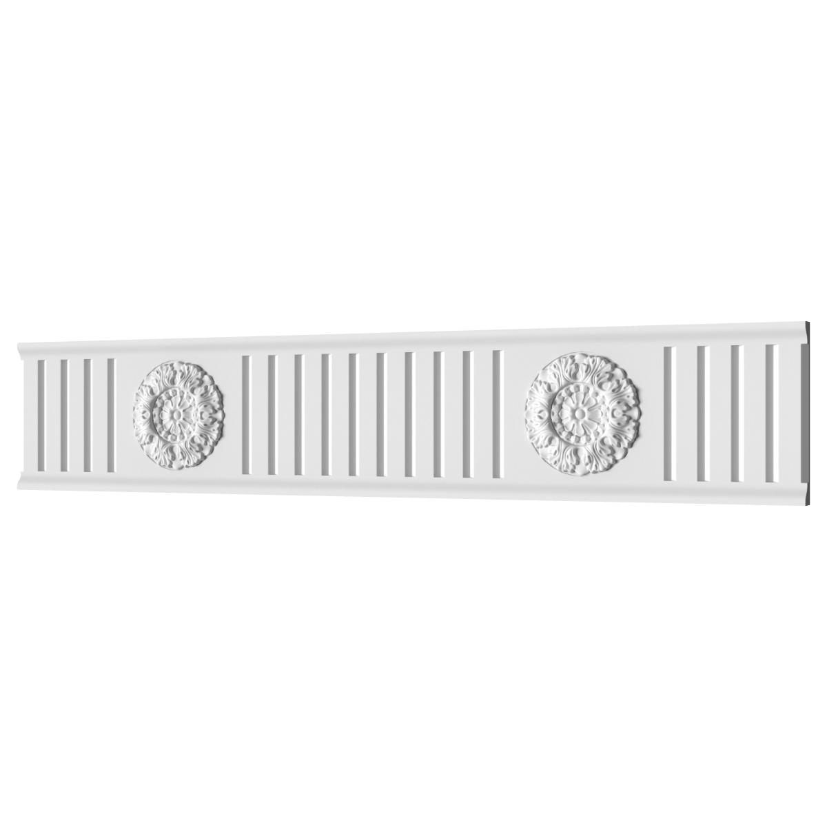 Ф‑66 — орнаментированный гипсовый фриз высотой 195 мм, выполненный в строгой архитектурной геометрии. Вертикальные каннелюры сочетаются с круглыми медальонами по краям, отсылая к классическим фасадным мотивам. Такой дизайн создаёт ощущение порядка, устойчивости и благородной выразительности, при этом сохраняет лёгкость линий.