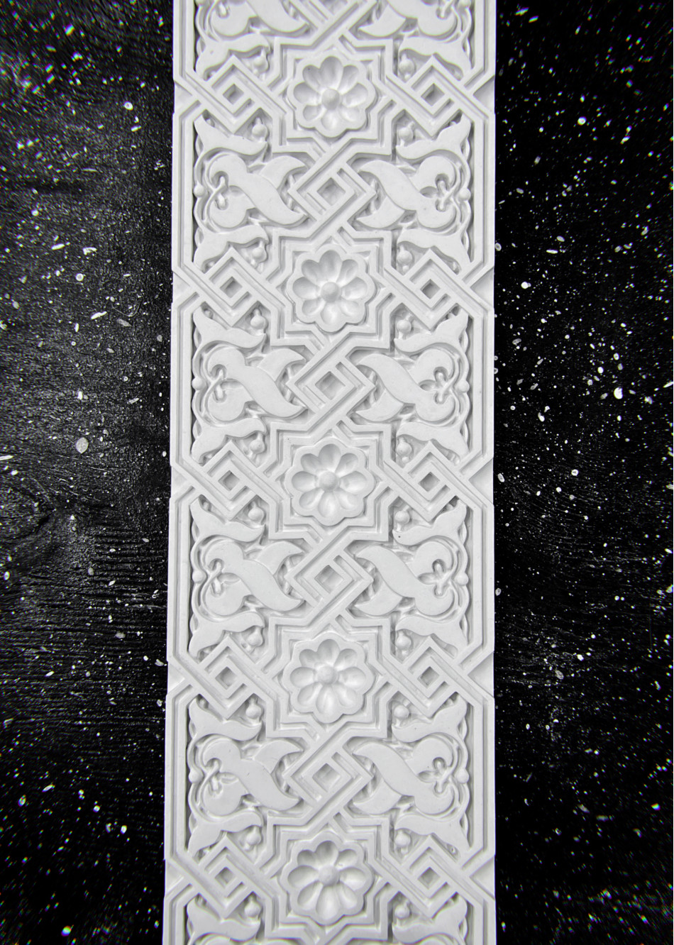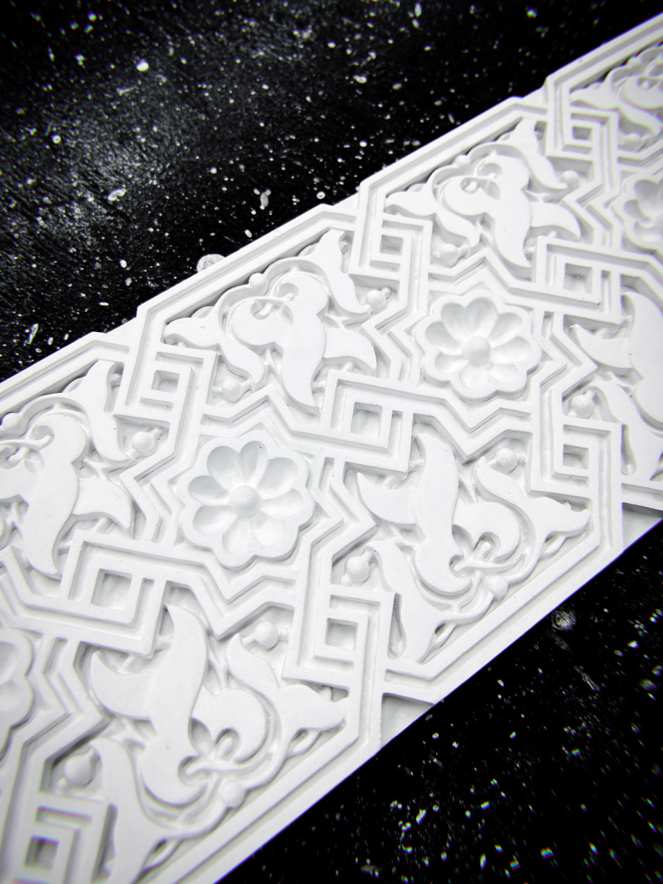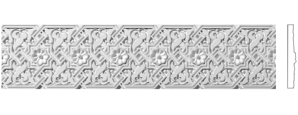 Ф‑93 — гипсовый фриз высотой 110 мм, украшенный мелким орнаментом в виде переплетённых листьев и геометричных линий. Такой рельеф создаёт визуально плотную, текстурную поверхность, добавляя пространству глубину и эстетику точности.