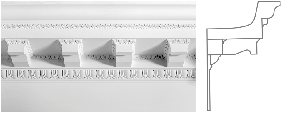 Карниз К-47 придаёт интерьеру монументальной дворцовой архитектурной роскоши. Его модульоны, рифленые элементы и богатые органические формы акцентируют архитектурные детали, наделяя пространство ощущением несравненного художественного совершенства, дизайнерской изысканности и дворцового величия. Идеален для залов с высокими потолками.