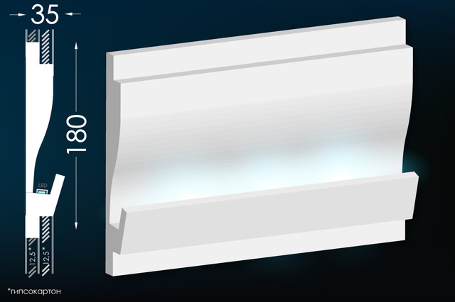 Тс‑10 — специализированный гипсовый карниз для скрытого освещения высотой 180 мм и шириной 25 мм, разработанный для встроенного монтажа светодиодных ламп и современных систем освещения. Его минималистичный, функциональный профиль со скрытой полостью для светильников создаёт архитектурно аккуратный эффект, придавая интерьеру современной элегантности и технологической утончённости, при этом обеспечивая оптимальное светораспределение.