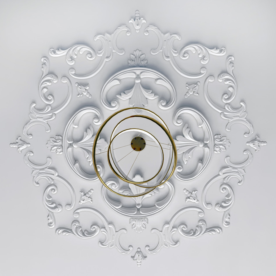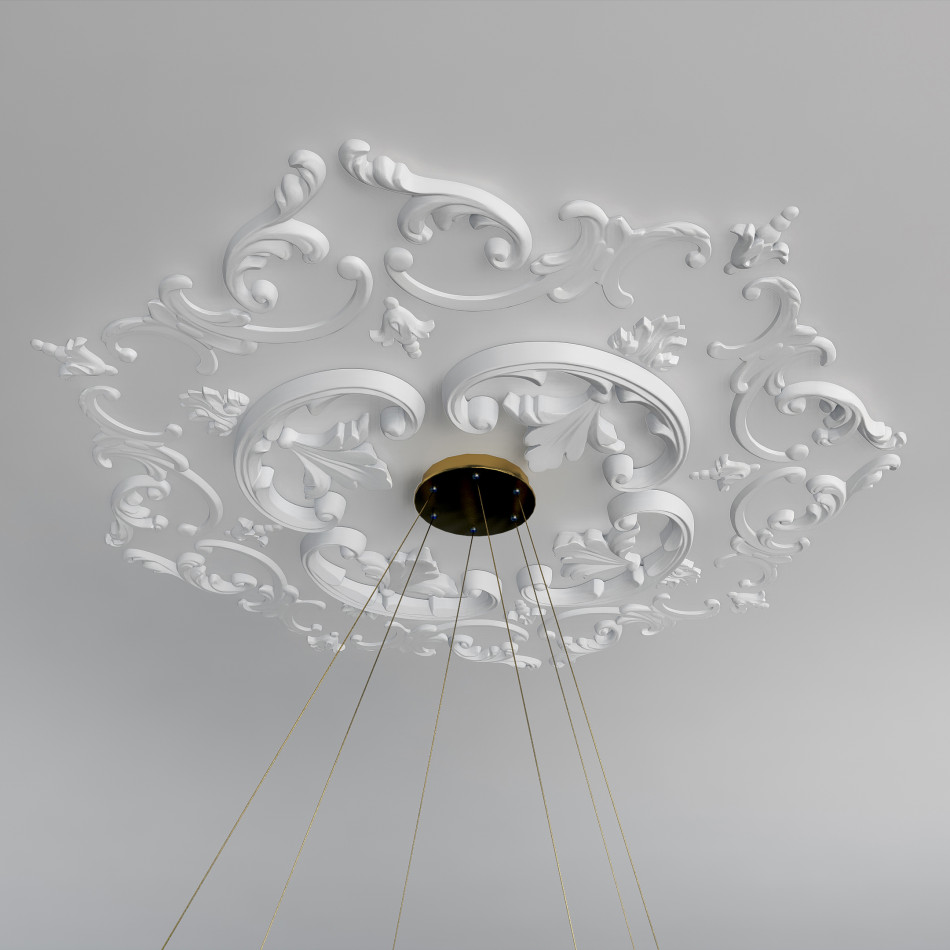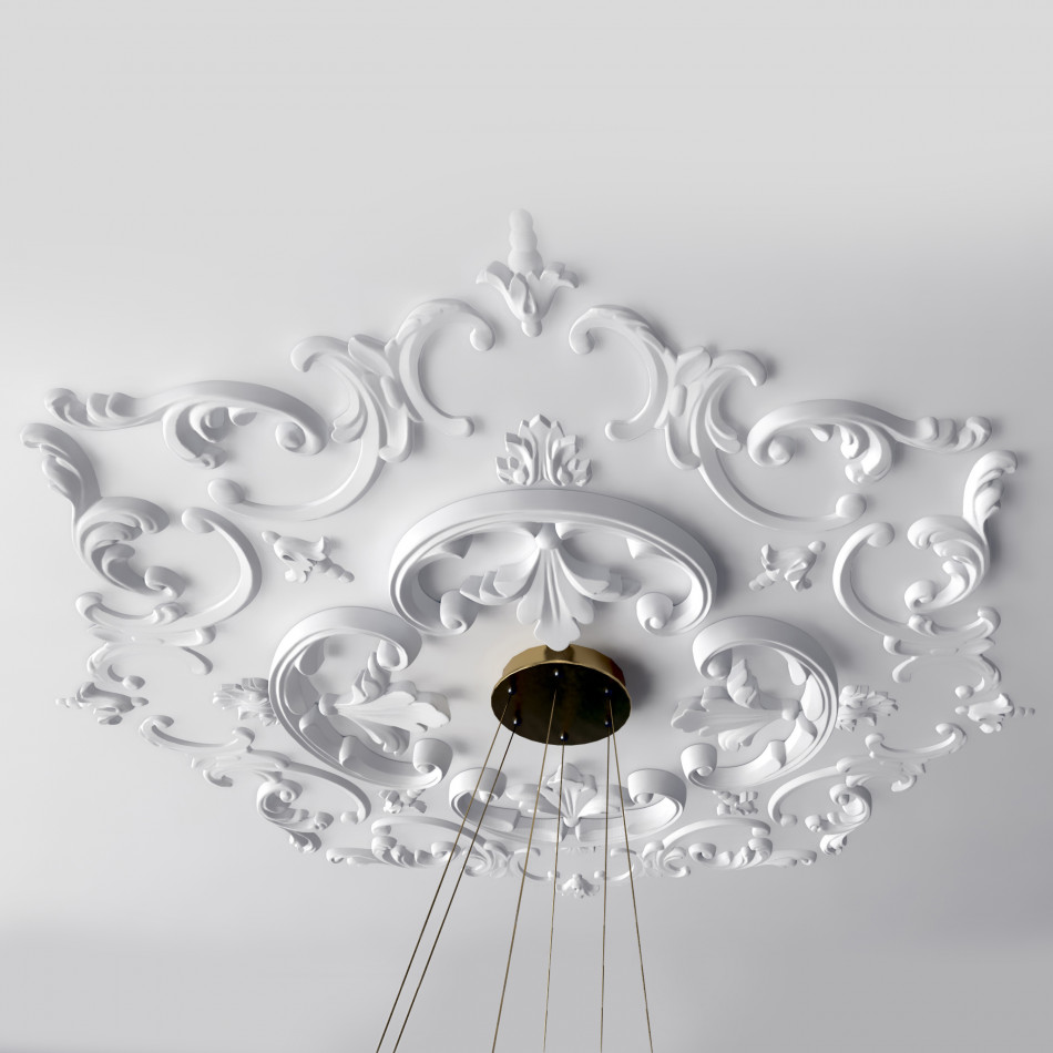 Розетка небольшого диаметра и состоящая из малого количества деталей. Станет хорошим декором для помещений небольшой площади, например, кухни, спальни или коридора.