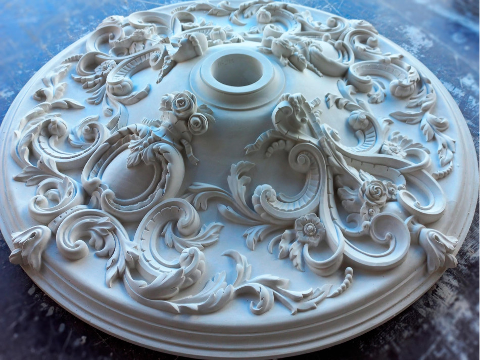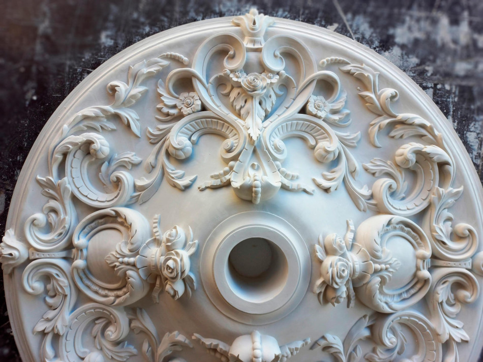 потолочный медальон гармонично сочетается в разных стилях. Потолочный декор из