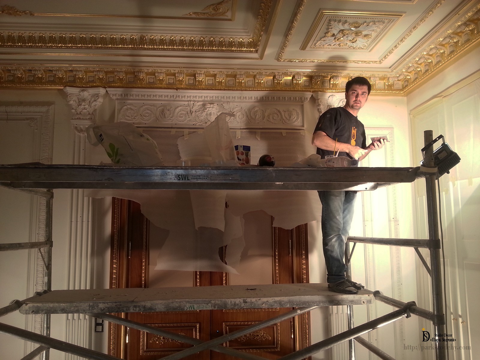 Декор применяют для оформления стенового и потолочного пространства, расстановки акцентов, зонирования помещений. Его размещают на чистой и ровной поверхности, поэтому первостепенной задачей мастера является удаление неровностей, отклонений плоскости, выведение высолов, жирных пятен, плесени и прочих загрязнений. Работы выполняют ручным методом, а также задействуют строительное оборудование – шлифовальные машинки, краскопульты для распыления пропиток и грунтовок.