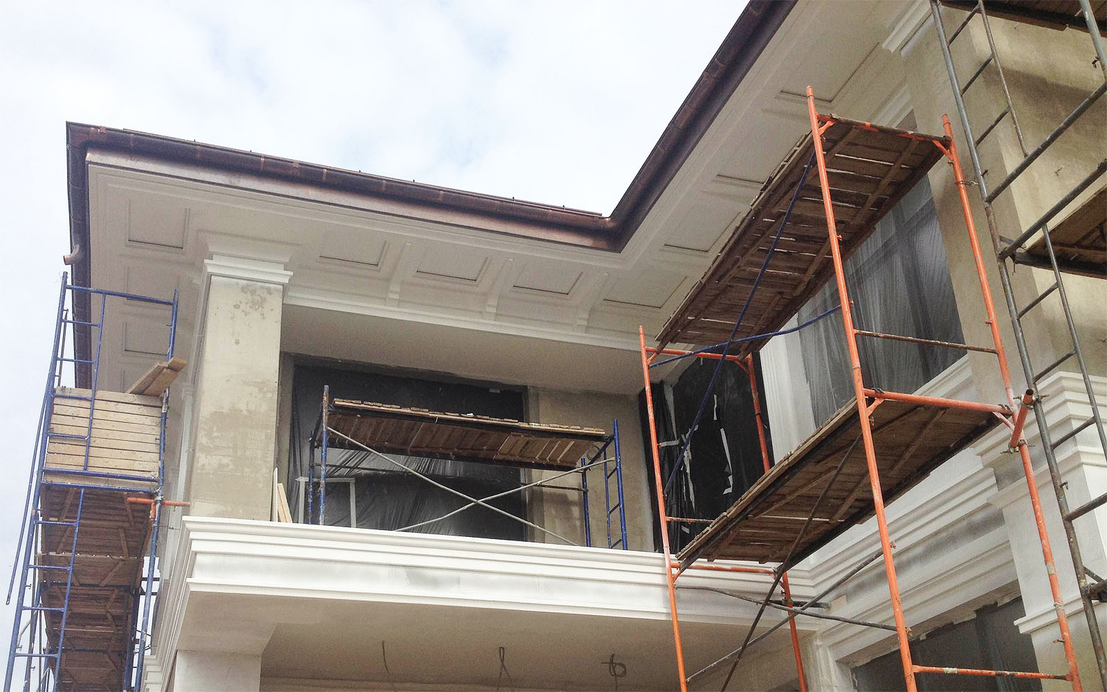- если на декоре имеется большое количество объемных орнаментов с выступающим рельефом, то в желобках после дождя скапливается вода. Защиту от осадков обеспечат водостоки;