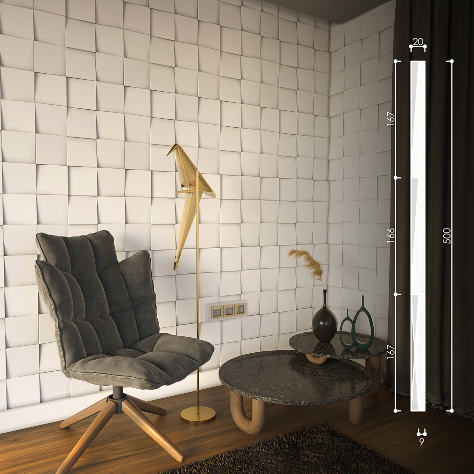Панель моделі Квадрати - це унікальна гіпсова 3D-панель із квадратним перетином і різноспрямованими сторонами, яка привертає увагу своєю брутальною естетикою. У її складі дев'ять маленьких квадратів об'єднуються в один великий, створюючи цікавий візуальний ефект. Ця панель є відмінною від усіх інших і дає змогу вам експериментувати з різними варіантами обертання та комбінування, щоб створювати унікальні малюнки та композиції на стінах.