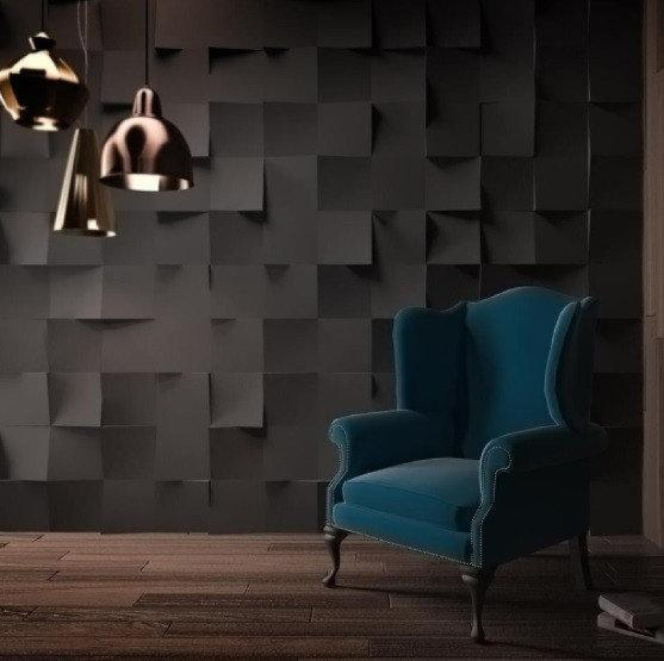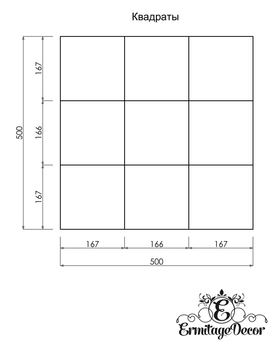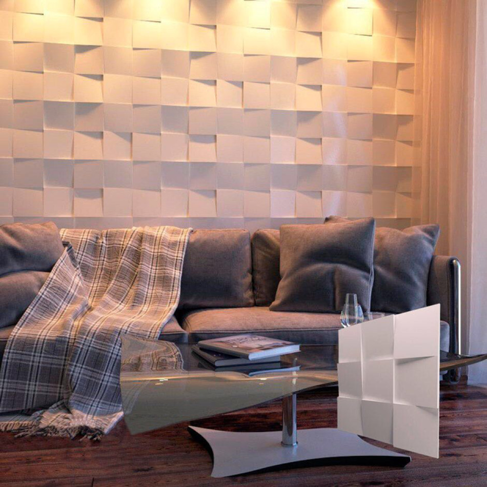 Панель моделі Квадрати - це гіпсова 3d панель квадратного перетину з різноспрямованими сторонами. У ній дев'ять квадратів малого розміру об'єднані в один великий. Панель має брутальний вигляд, відрізняється від усіх інших. Панель можна обертати і створювати комбінації та малюнки.