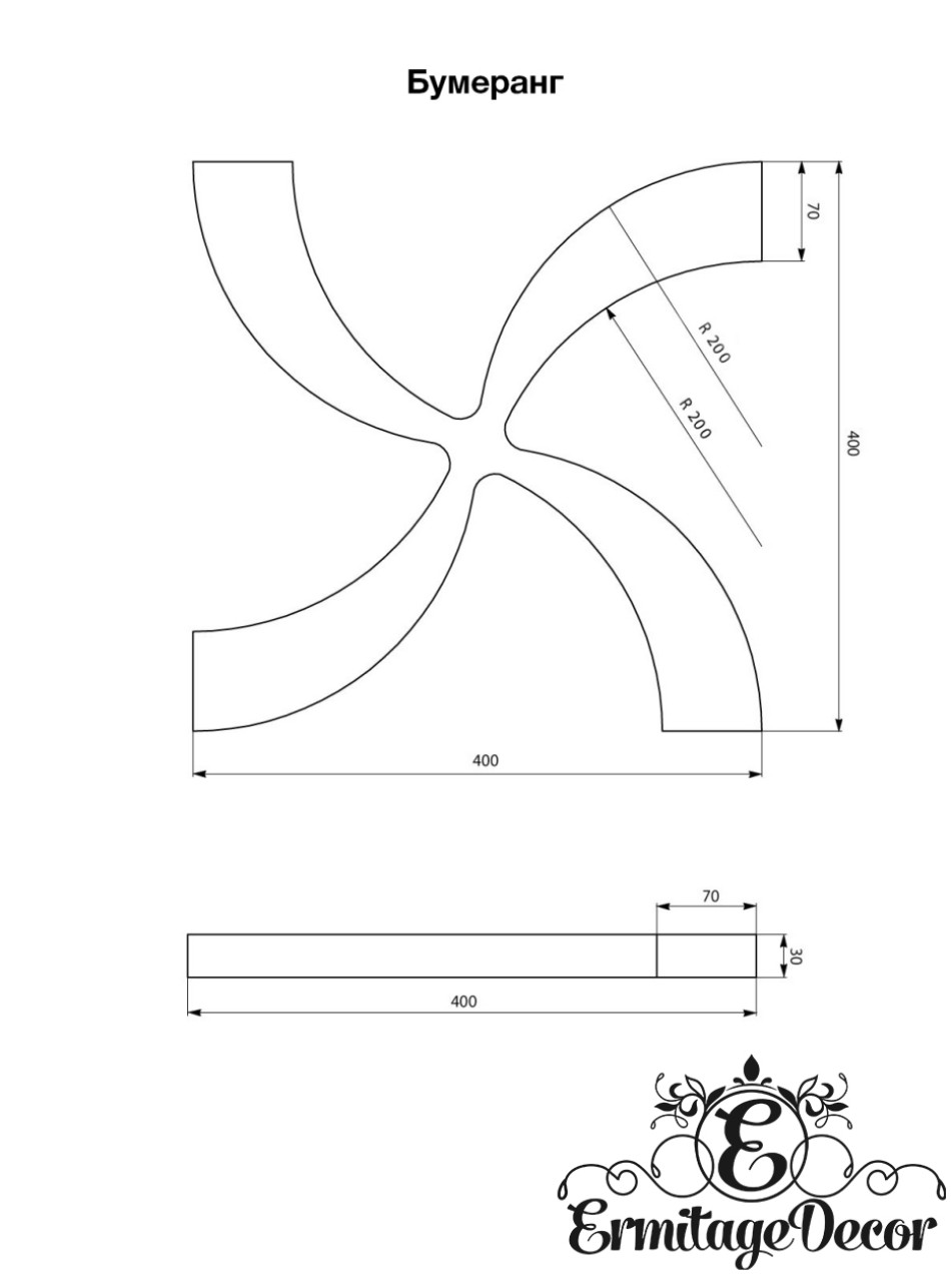 Панель моделі Бумеранг - це гіпсова 3D-панель у формі зигзага. Ця панель може бути встановлена на стіну безпосередньо, без підкладки. Стикується по кутах панелі. Можна обертати панель по осі в різних комбінаціях і таким чином дає змогу створювати різноманітні малюнки та композиції.