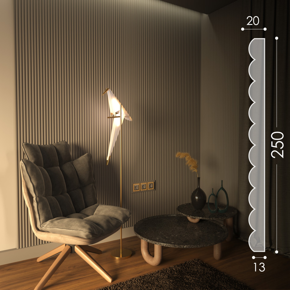 Панелі моделі Paralline - це гіпсові 3d панелі з формою профілю у вигляді рівномірних валиків, з ефектом м'якої напівкруглої поверхні. Найкраще підходить для сучасних інтер'єрів, таких як лофт або громадських приміщень і зон. Промені світла м'яко проникають крізь вигини, створюючи ефект ажурної тіні та надаючи відчуття легкості й граціозності, ковзаючи округлою рівномірною поверхнею.