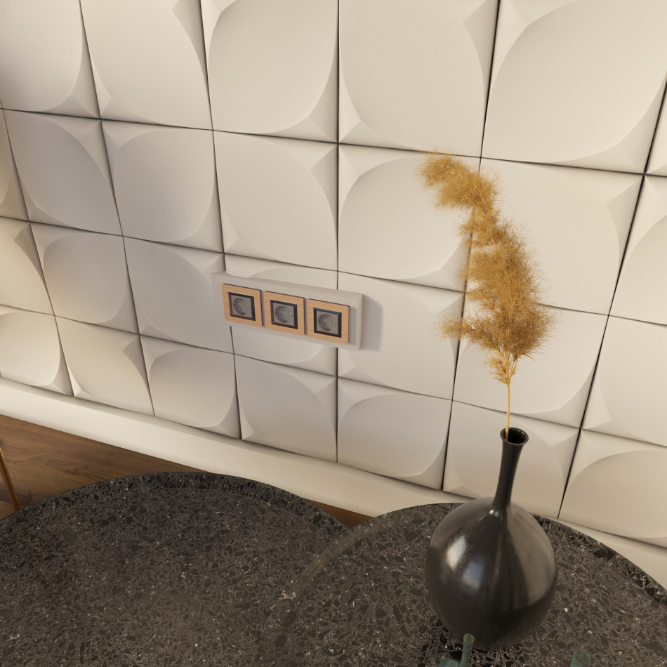 Унікальна 3d-панель для ваших інтер'єрів, яка вже стала класикою. Неповторний образ, чіткий геометричний орнамент, структурує і робить простір приміщення ясним і зручним. Цю панель ідеально використовувати в кімнатах загального користування - вітальнях, холах. А також у школах, кафе і ресторанах. Має чудовий вигляд на освітлених місцях. Хоч при штучному, хоч при природному освітленні.
