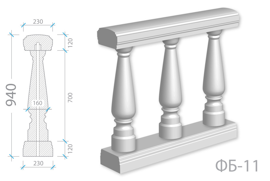 Класична балюстрада ФБ-11 з елегантною, витонченою балясиною зробить архітектуру будівлі більш цілісною. Конструкція може встановлюватися як всередині, так і зовні будівлі. Вона стійка негативних погодних явищ і зберігає прекрасний зовнішній вигляд тривалий час.