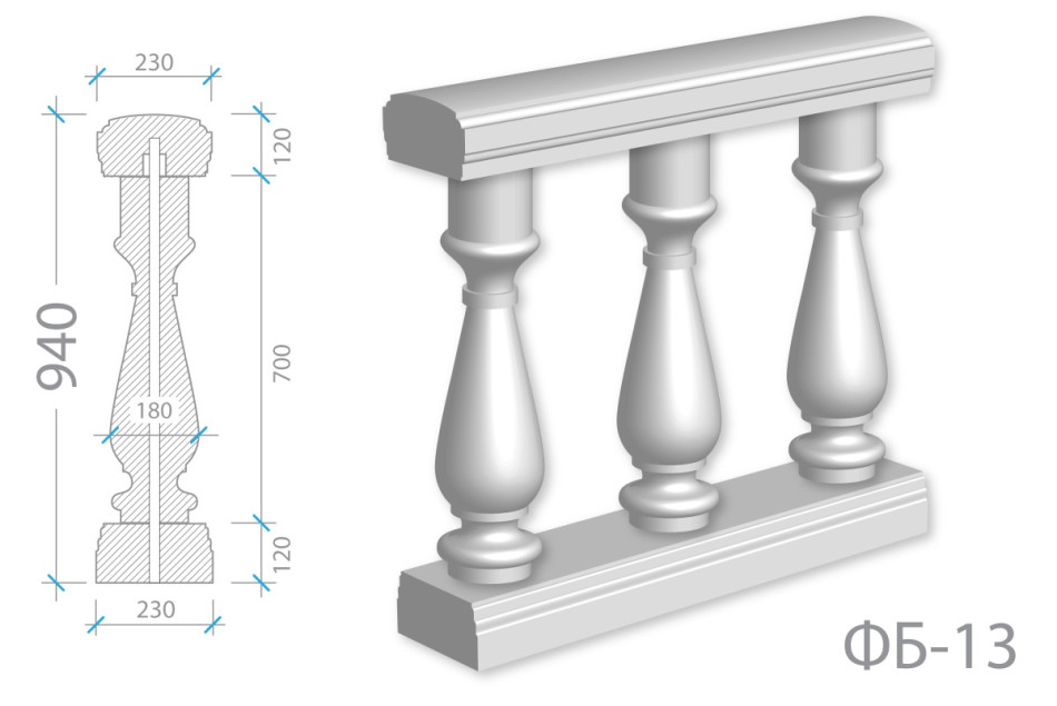 Класична балюстрада ФБ-13 з елегантною, витонченою балясиною зробить архітектуру будівлі більш цілісною. Конструкція може встановлюватися як всередині, так і зовні будівлі. Вона стійка негативних погодних явищ і зберігає прекрасний зовнішній вигляд тривалий час.