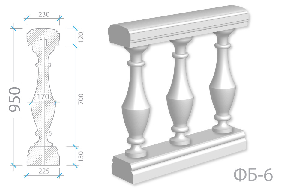 Класична балюстрада ФБ-6 з елегантною, витонченою балясиною зробить архітектуру будівлі більш цілісною. Конструкція може встановлюватися як всередині, так і зовні будівлі. Вона стійка негативних погодних явищ і зберігає прекрасний зовнішній вигляд тривалий час.