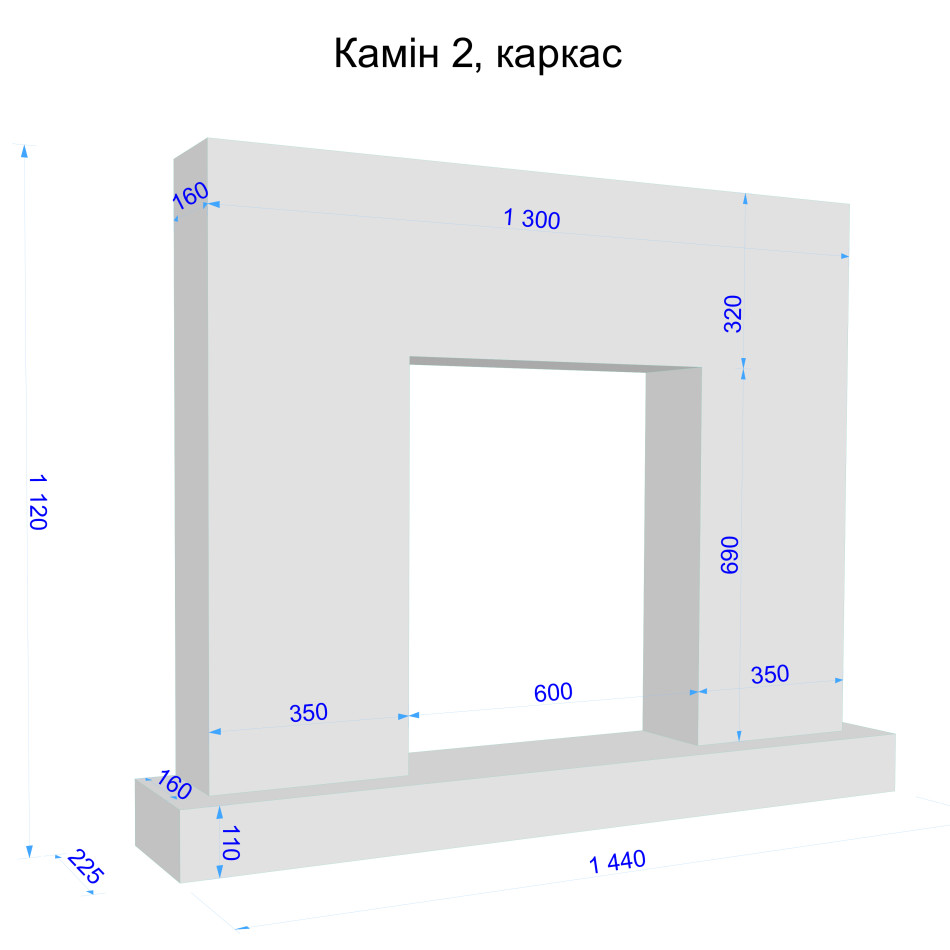Каркас каміну в комплект не входить. Каркас необхідно виготовити* згідно з кресленням (у фотогалереї до виробу). Розміри каркасу можуть бути адаптовані під ваше бажання або приміщення.