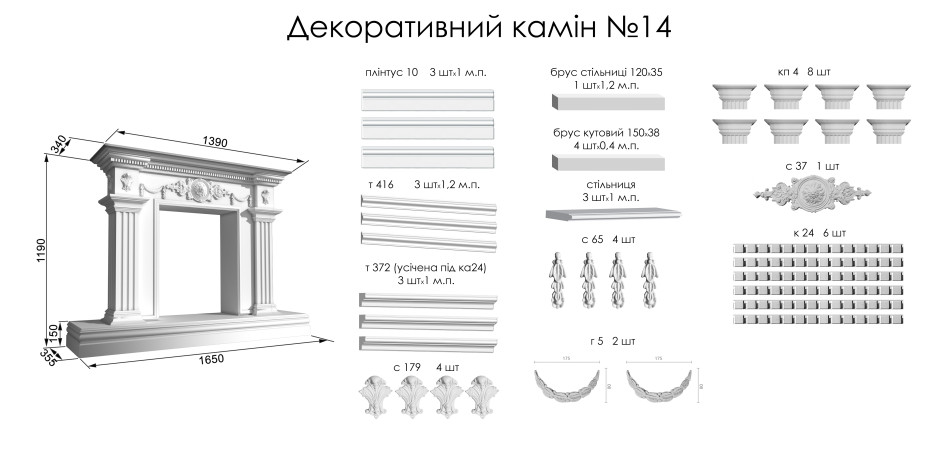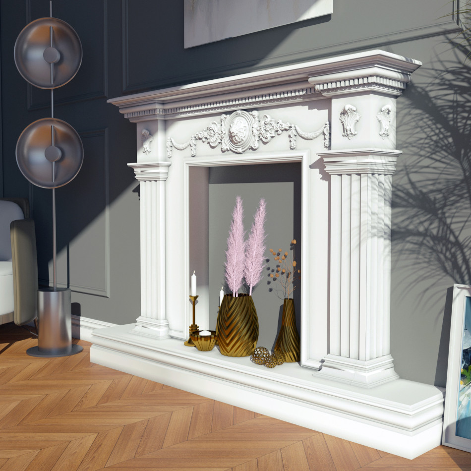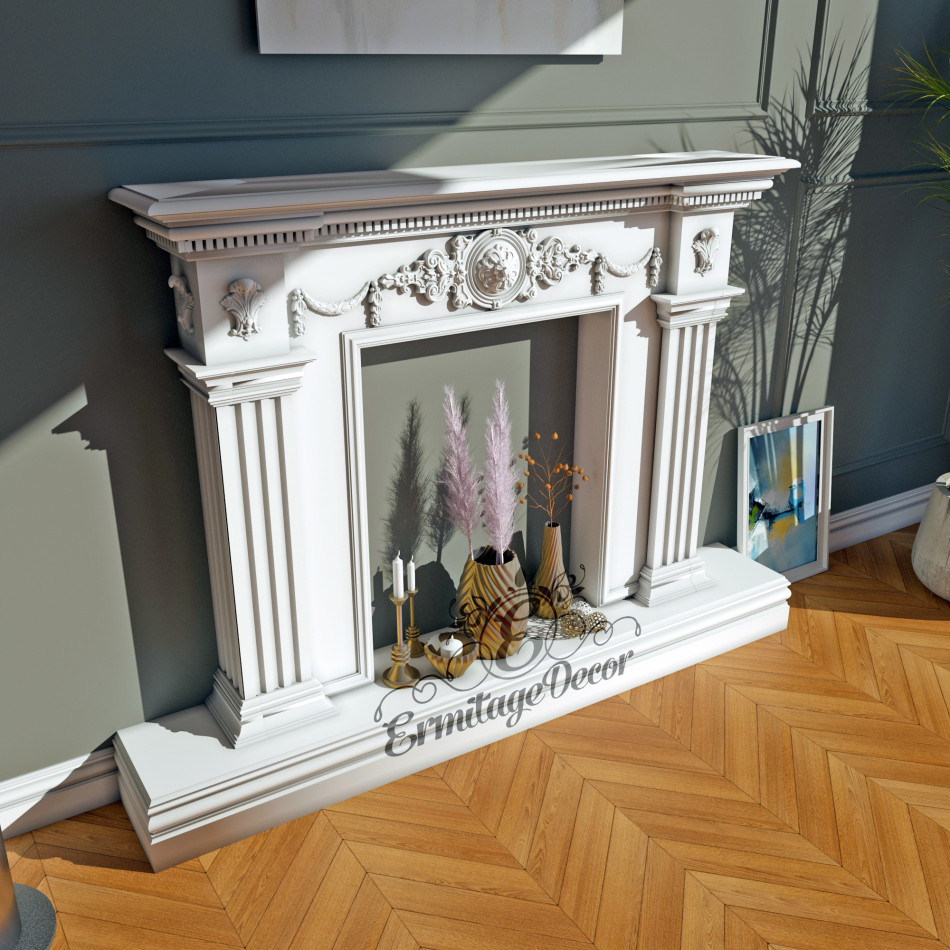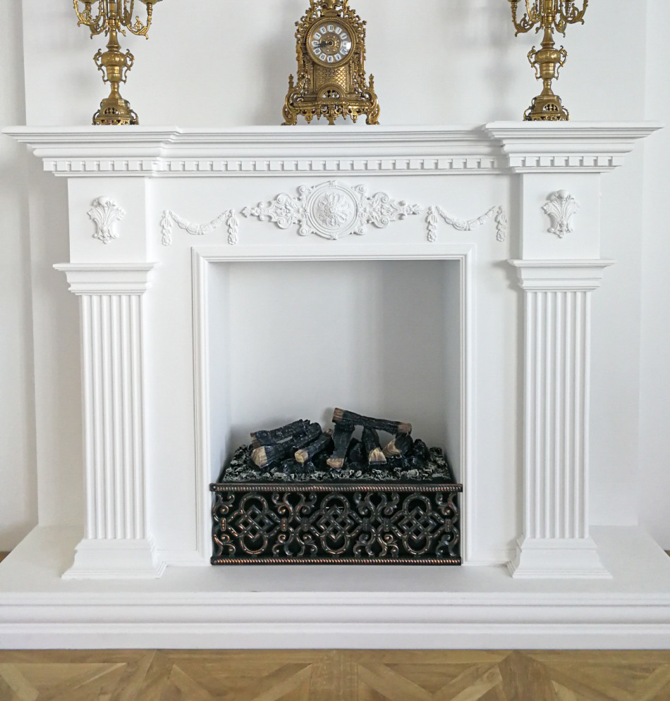 Декор складається з невеликих, симетрично розташованих елементів. Цей камін ідеально поєднується з камінною піччю, фальш-каміном, електрокаміном або каміном із цегли. Верхня плита каміна є корисною поверхнею, яку можна використовувати як стіл.