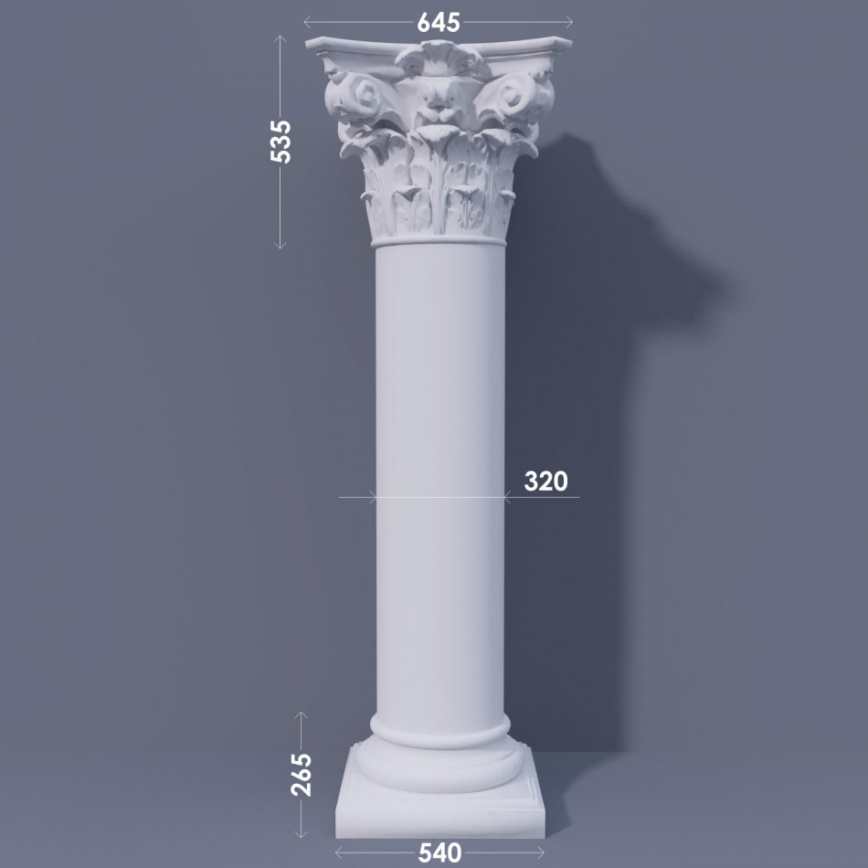 Фасадна колона виготовлена за міжнародними стандартами з використанням високоякісних матеріалів, в основі пінополістирол, завдяки якому виріб має маленьку вагу, надалі позначається в легкому і швидкому монтажі.