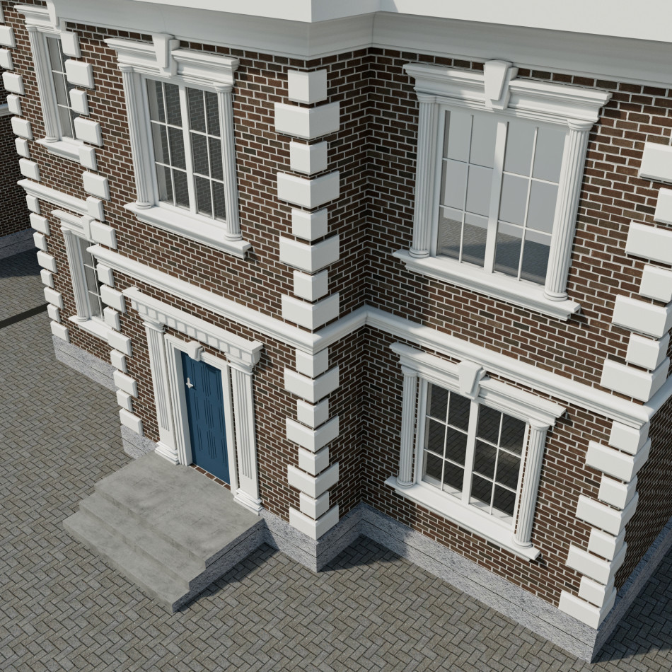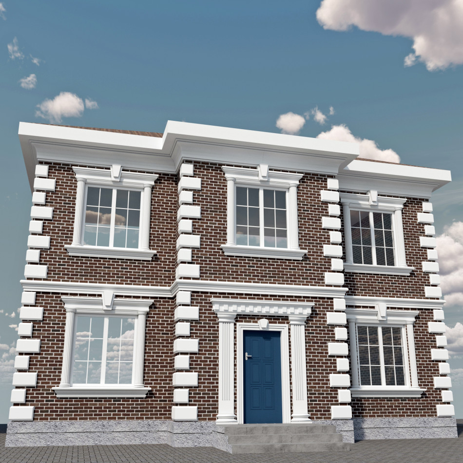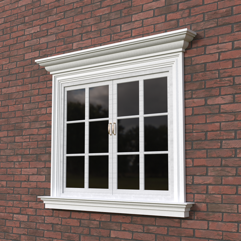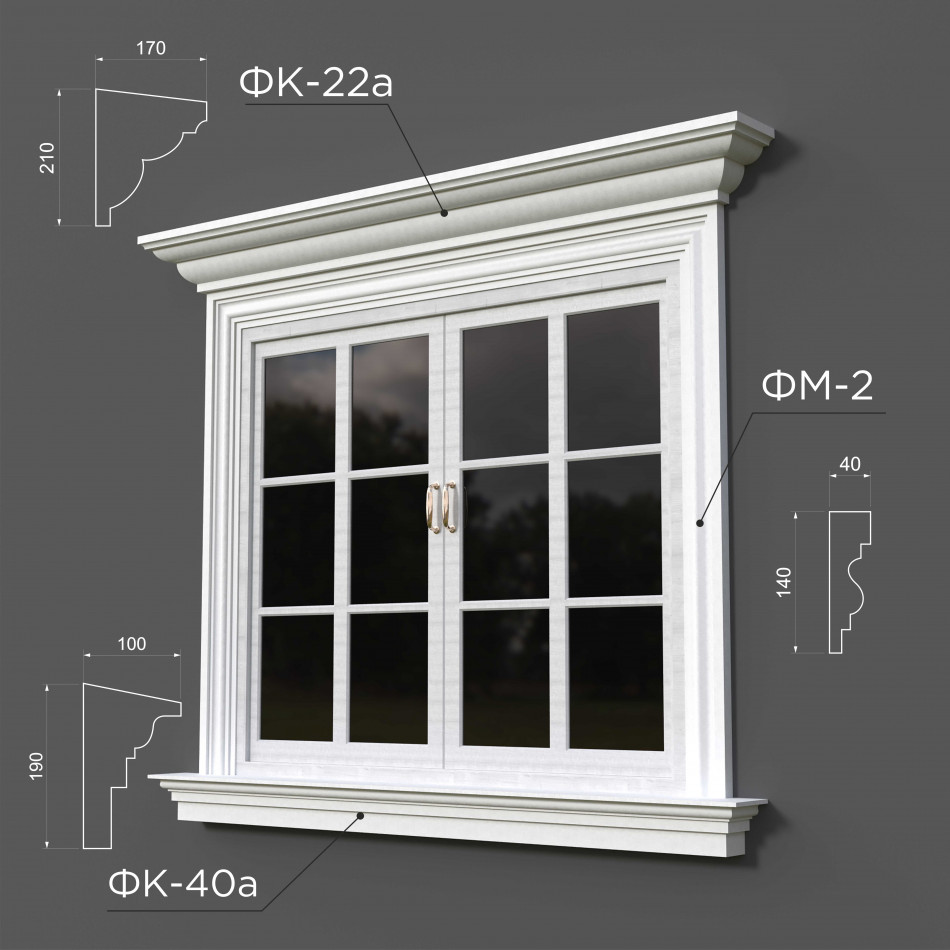 Даний комплект включає обрамлення навколо вікон, декоративну раму під вікном, декоративний камінь у верхній частині, якщо він відповідає стилю. Обрамлення вікон може бути виконано в один або два шари, залежить від необхідної ширини. Його ширина підбирається з урахуванням розмірів вікна і дистанції, з якої можна бачити цей фасадний декор. Безліч варіантів поєднань елементів дають змогу вибрати композицію на будь-який смак.