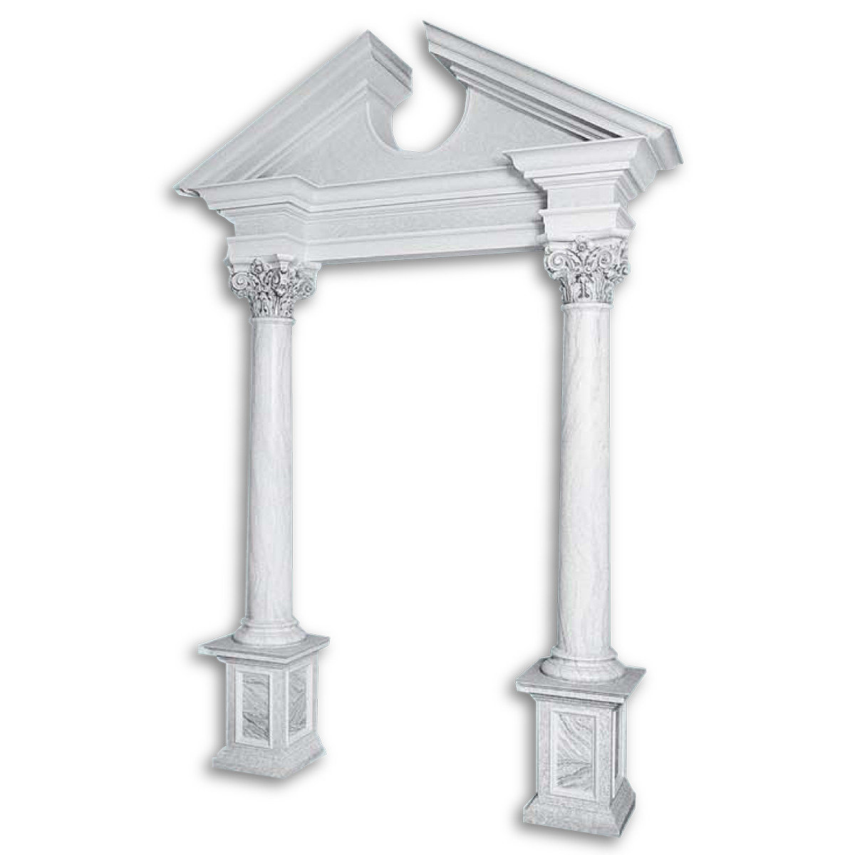 АПО-2 — гіпсова архітектурна композиція "Арка, проєм, арочне обрамлення" з вишуканими скульптурними елементами у формі класичного портика з двома колонами та фронтоном. Композиція поєднує класичні архітектурні форми з деталізованими капітелями коринфського ордеру, пілястрами з рослинним орнаментом та геометричним декором. Масштабна композиція створює монументальний архітектурний ансамбль, ідеальний для оформлення великих архітектурних проїмів, портиків та декоративних композицій, типовий для елітних інтер'єрів класицизму та неокласики.