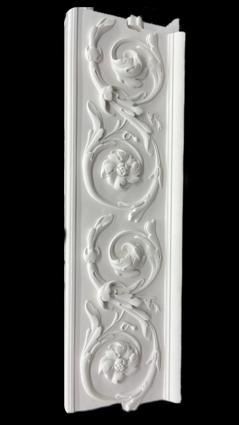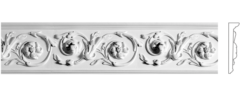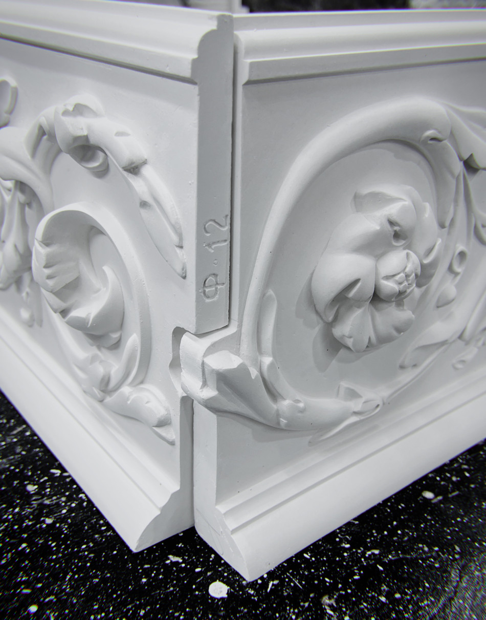 Профіль: Найбільш значний профіль у лінійці фризів, що має яскраво виражений, насичений класичний орнамент. Ф-12 — це не просто декор, а ключовий архітектурний елемент, який миттєво перетворює інтер’єр, надаючи йому розкішного, імперського вигляду. Він створює глибоку світлотінь та чітко артикулює периметр приміщення.