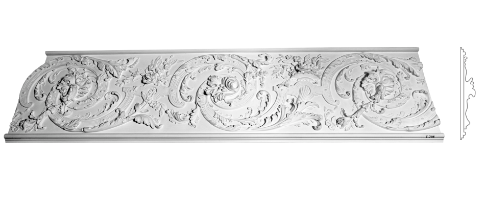 Профіль: Винятково високий профіль, що створює максимально розкішний архітектурний фриз у класичному стилі. Його висота майже півметра робить його головним акцентом у приміщенні. Фриз має виразний центральний орнамент, обрамлений гладкими тягами зверху і знизу, що забезпечує чітку архітектурну завершеність. Глибокий рельєф гарантує вражаючу гру світлотіні.