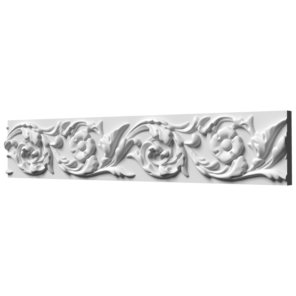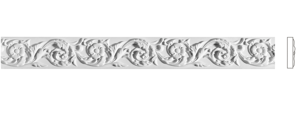 Ф‑63 — орнаментований гіпсовий фриз висотою 63 мм із витонченим рельєфом класичного типу. Його композиція побудована на плавних завитках і листових мотивах, що створюють гармонійний ритм і додають простору елегантності. Завдяки грі світла й тіні поверхня набуває об’єму та благородної глибини, що ідеально пасує для інтер’єрів із класичним або сучасно‑декоративним стилем.