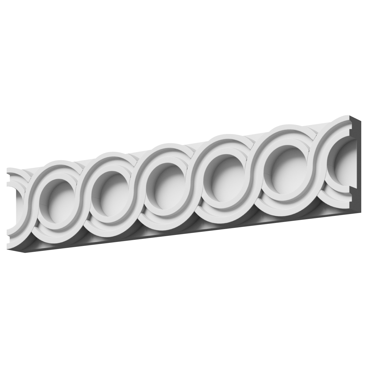 Ф‑71 — це гіпсовий фриз висотою 44 мм із чітким рельєфом, побудованим на послідовності округлих ланок. Динамічний орнамент «ланцюг» додає інтер’єру структурності та декоративного ритму, виглядає ефектно як у білому кольорі, так і після фарбування.