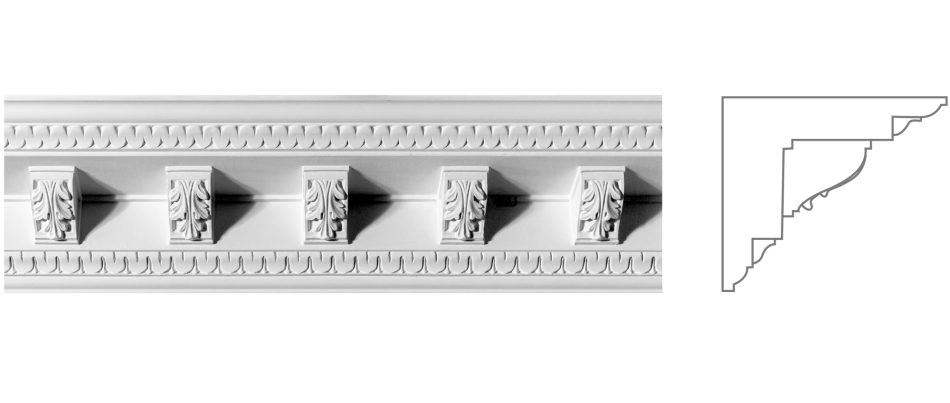 Карниз К‑109 підходить для парадних кімнат, віталень, офісів з класичним дизайном і готельних просторів. Орнамент із дентикулами додає виразного архітектурного ритму, створюючи відчуття порядку та пропорційності — ознаки істинної класики.