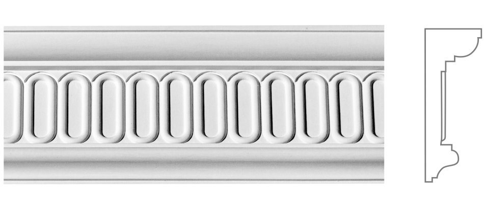 К‑113 — гіпсовий карниз висотою 125 мм і шириною 45 мм, виконаний у класичному стилі з овальним рельєфним орнаментом, що рівномірно повторюється по всій довжині. Такий мотив — яєчний фриз (egg‑and‑dart) — традиційний елемент античної архітектури, який символізує рівновагу й гармонію. Він поєднує геометричну чіткість та м’якість форми, додаючи простору ритму й виразності.