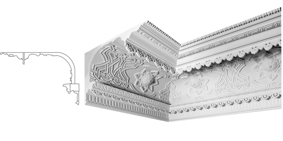 Карниз К‑115 створює атмосферу розкоші, урочистості та архітектурної вагомості. Це не просто декор — це композиційний центр інтер’єру, який задає тон усьому архітектурному рішенню.