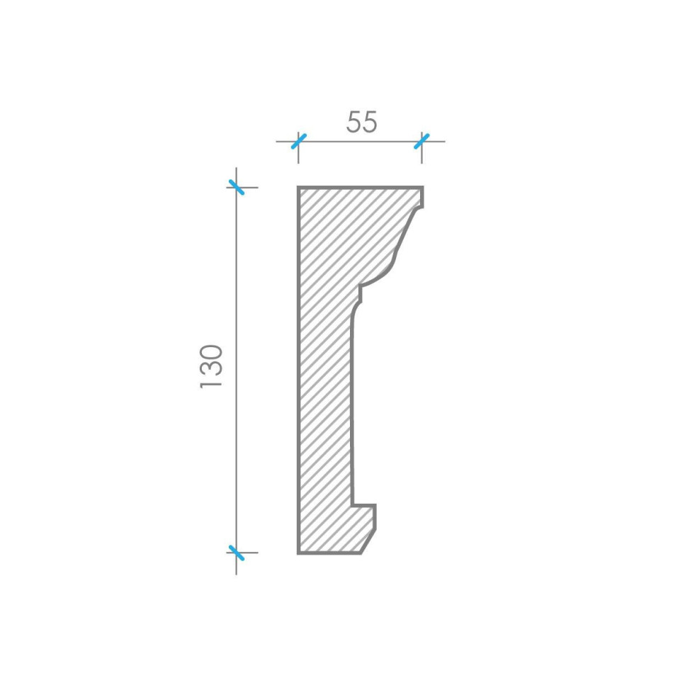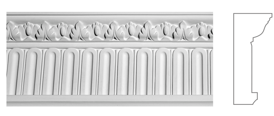 К‑121 — гіпсовий карниз висотою 130 мм і шириною 55 мм, оформлений у традиціях античної класики. Його композиція поєднує вертикальні канелюри у нижній частині з декоративним фризом, оздобленим стилізованими акантовими листками у верхній частині. Такий ритм створює відчуття порядку, симетрії й витонченої строгості.