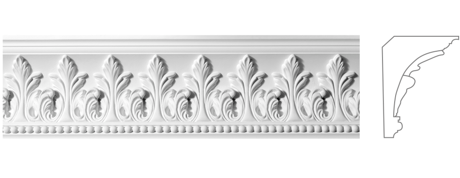 К‑129 — гіпсовий карниз висотою 160 мм і шириною 120 мм, прикрашений витонченим орнаментом із акантових листків, розташованих у рівномірному ритмі. Декор доповнений нижнім рядом дрібних перлинок, що додають малюнку завершеності та вишуканості. Це елемент, який поєднує монументальність класики з делікатним декоративним характером.