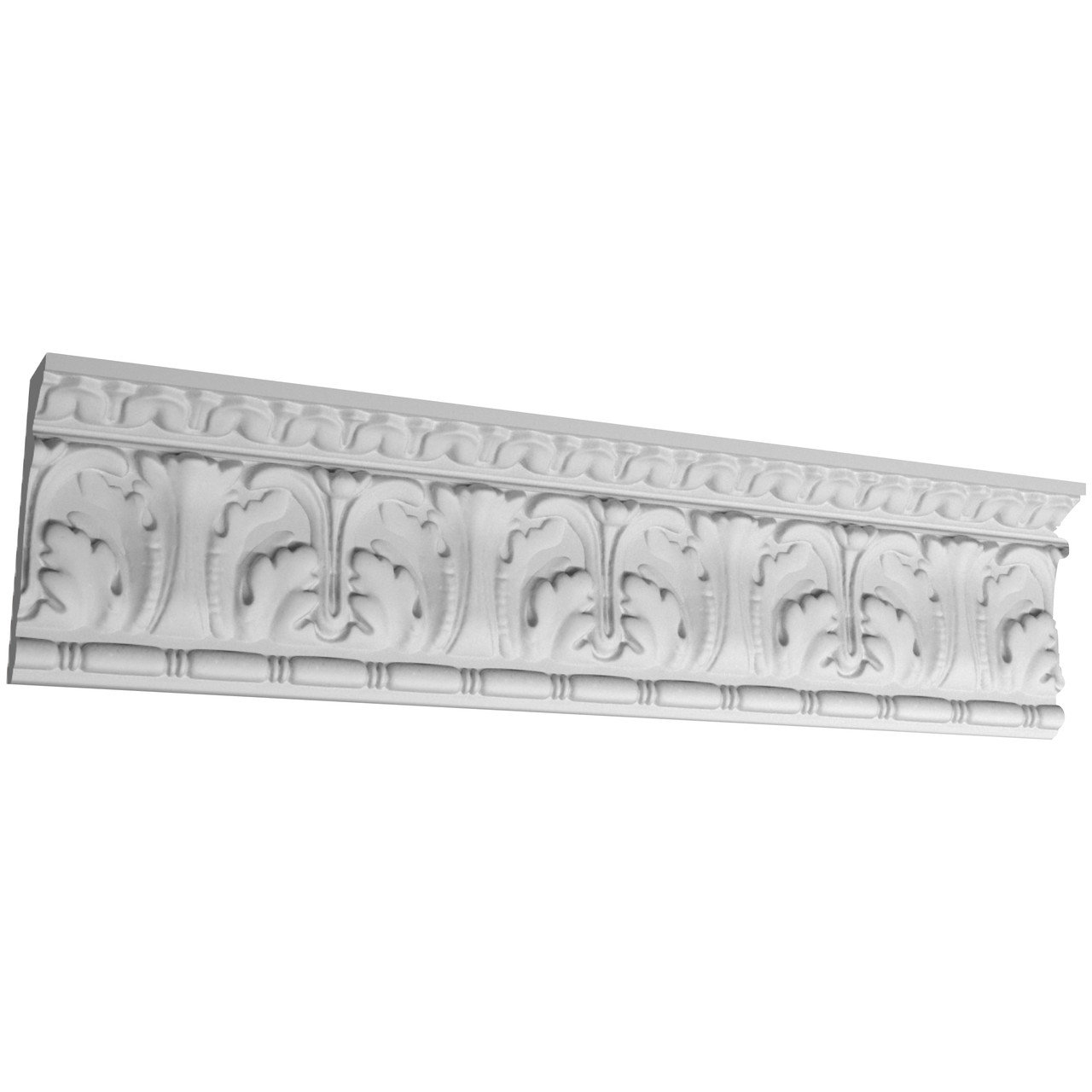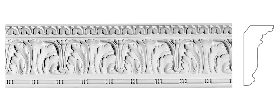 К‑13 — гіпсовий карниз висотою 118 мм і шириною 40 мм, прикрашений рельєфним орнаментом із акантових листків і тонкою декоративною стрічкою. Композиція відзначається чистими лініями й чіткою симетрією, що робить цей профіль універсальним для класичних і сучасно‑стриманих інтер’єрів.