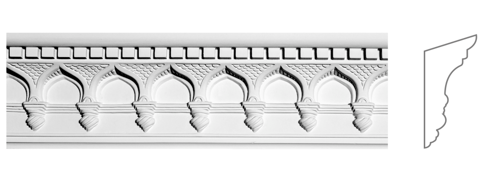 К‑14 — гіпсовий карниз висотою 95 мм і шириною 45 мм, прикрашений орнаментом із стрілчастими арками, що створюють ефект легкого ритму та декоративної глибини. Орнамент нагадує середньовічну або мавританську архітектуру, додаючи простору вишуканості й орнаментальності.