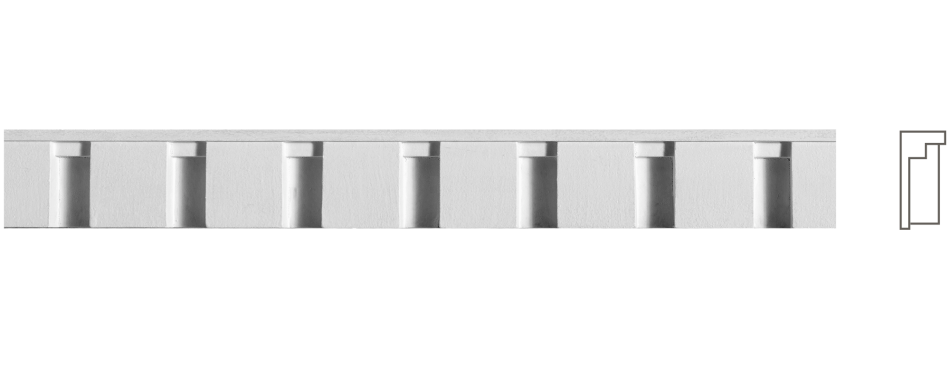 К‑149 — гіпсовий карниз висотою 40 мм і шириною 18 мм, прикрашений геометричним орнаментом у вигляді вертикальних пілястр (дентикулів). Це створює чіткий, упорядкований ритм і додає простору сучасного архітектурного характеру, водночас зберігаючи класичну витонченість.