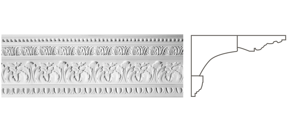 К‑163 — гіпсовий карниз висотою 165 мм і шириною 260 мм, прикрашений комплексним багатошаровим орнаментом із акантових листків, дентикулів, волют та класичних композицій. Це монументальна архітектурна форма з виключною глибиною пластичності, яка нагадує класичну архітектуру великих палаців та храмів.