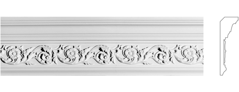 К‑183 — гіпсовий карниз висотою 145 мм і шириною 58 мм, прикрашений динамічним органічним орнаментом із волют, розеток, лози та класичних композицій. Це витончена архітектурна форма з гармонійною органічною пластичністю, яка нагадує класичну архітектуру та традиційні архітектурні ордери.