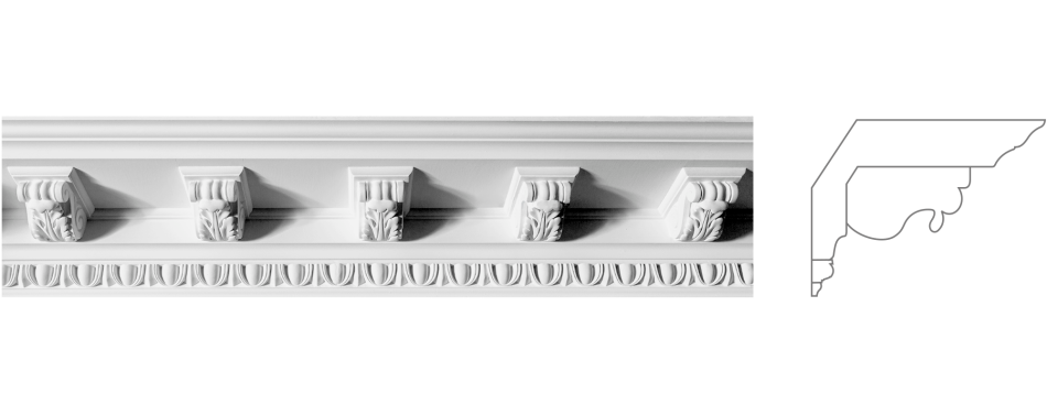 Карниз К-59a додає інтер'єру монументальної палацової архітектурної розкіші. Його модульони та рельєфні елементи акцентують архітектурні деталі, надаючи простору почуття незрівнюваної мистецької досконалості, дизайнерської вишуканості та палацової величавості. Ідеально для залів з високими стелями.