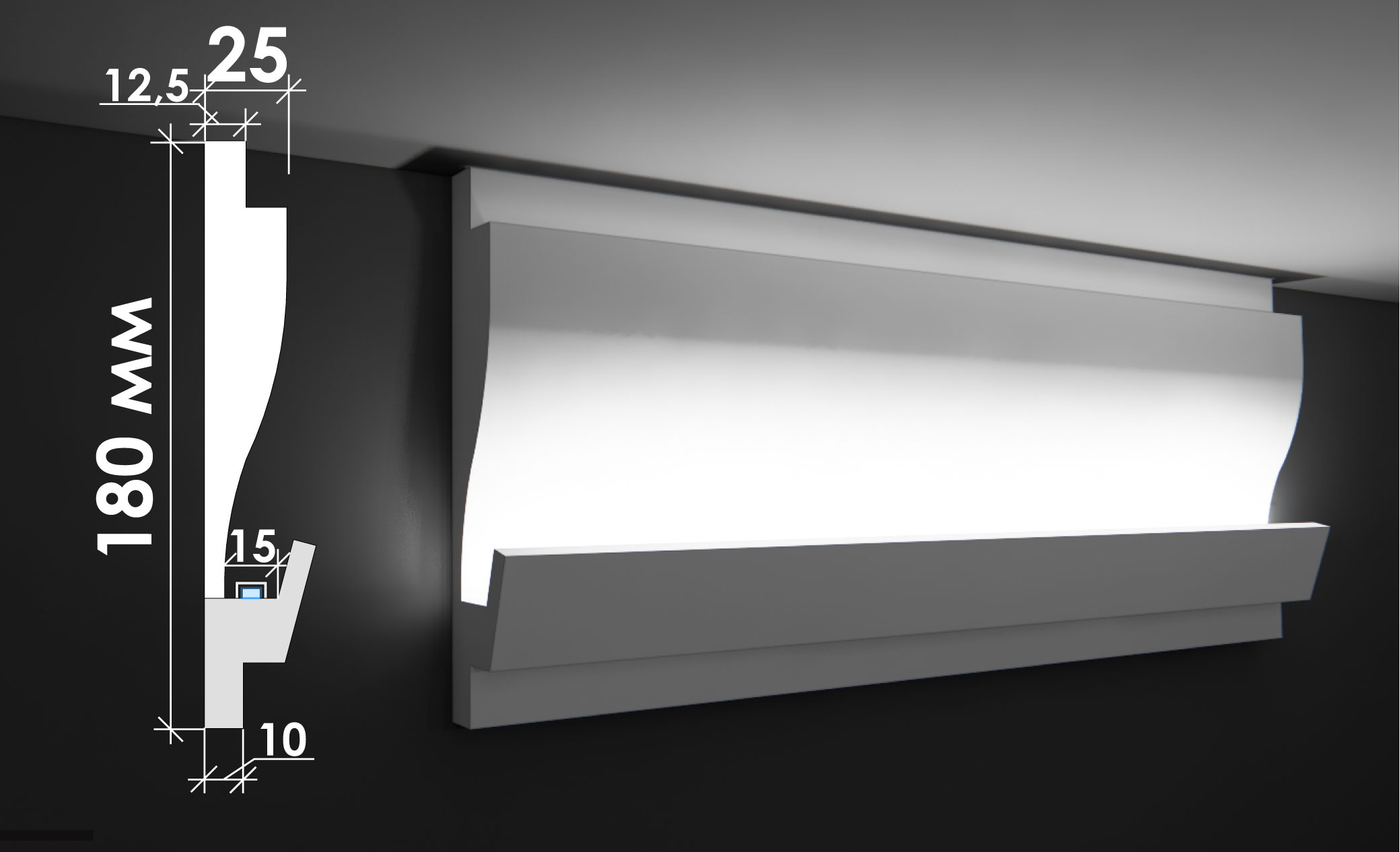 Тс‑10 — спеціалізований гіпсовий карниз для скритого освітлення висотою 180 мм та шириною 25 мм, розроблений для встроєного монтажу світлодіодних ламп та сучасних систем освітлення. Його мінімалістичний, функціональний профіль з прихованою порожниною для світильників створює архітектурно аккуратний ефект, надаючи інтер'єру сучасної елегантності та технологічної утонченості, при цьому забезпечуючи оптимальне світлорозповсюдження.