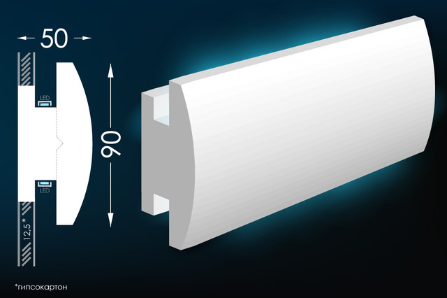 Тс‑14 — спеціалізований гіпсовий карниз для скритого освітлення висотою 90 мм та шириною 50 мм, розроблений для встроєного монтажу світлодіодних ламп та сучасних систем освітлення з оптимальною конструкцією. Його мінімалістичний, функціональний профіль з прихованою порожниною 10,15 мм для світильників створює архітектурно аккуратний ефект, надаючи інтер'єру сучасної елегантності та технологічної утонченості, при цьому забезпечуючи оптимальне світлорозповсюдження з гармонійними пропорціями.