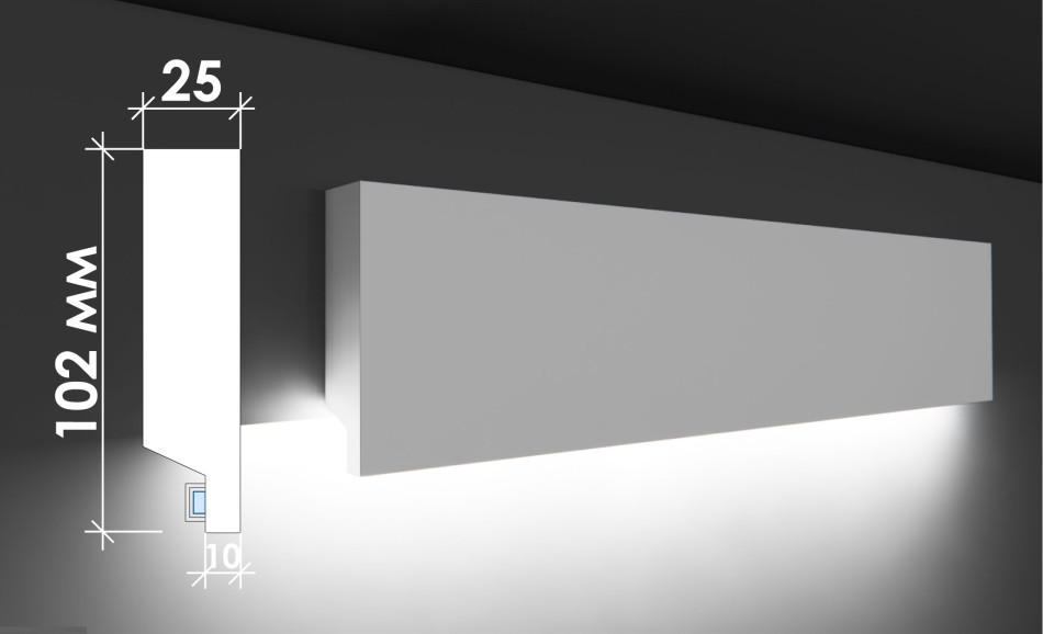 Тс‑19 — спеціалізований гіпсовий карниз для скритого освітлення висотою 102 мм та шириною 25 мм, розроблений для встроєного монтажу світлодіодних ламп та сучасних систем освітлення з елегантною, витонченою конструкцією. Його мінімалістичний, функціональний профіль з прихованою порожниною 10 мм для світильників створює архітектурно аккуратний ефект, надаючи інтер'єру сучасної елегантності та технологічної утонченості, при цьому забезпечуючи оптимальне світлорозповсюдження з виразною вертикальною присутністю.