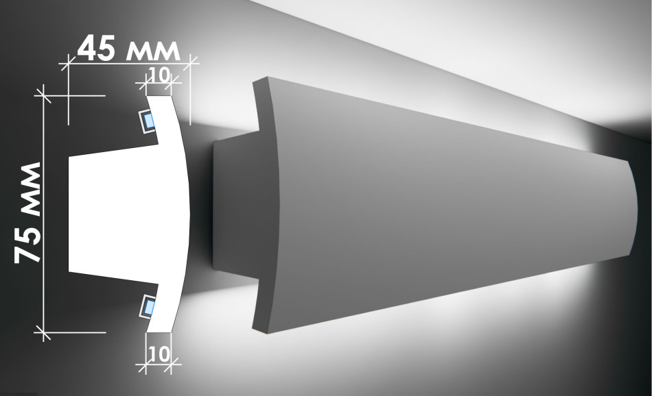 Тс‑22 — спеціалізований гіпсовий карниз для скритого освітлення висотою 75 мм та шириною 45 мм, розроблений для встроєного монтажу світлодіодних ламп та сучасних систем освітлення з універсальною, багатофункціональною конструкцією. Його сучасний, функціональний профіль з двома прихованими порожнинами 10 мм для світильників створює гнучкий архітектурний ефект, надаючи інтер'єру елегантності та технологічної утонченості, при цьому забезпечуючи оптимальне світлорозповсюдження з універсальною функціональністю.