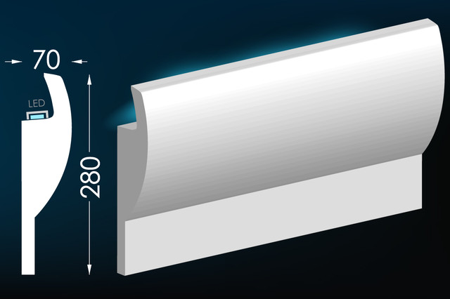 Тс‑28 — спеціалізований гіпсовий карниз для скритого освітлення висотою 280 мм та шириною 70 мм, розроблений для встроєного монтажу світлодіодних ламп та потужних систем освітлення з монументальною, архітектурно домінуючою конструкцією. Його архітектурний, функціональний профіль з прихованою порожниною та великим закруглениям для світильників створює монументальний ефект, надаючи інтер'єру грандіозності, технологічної утонченості та архітектурної домінуючої присутності.