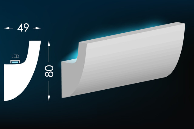 Тс‑29 — спеціалізований гіпсовий карниз для скритого освітлення висотою 80 мм та шириною 50 мм, розроблений для встроєного монтажу світлодіодних ламп та сучасних систем освітлення з кутовою, органічно динамічною конструкцією. Його архітектурний, функціональний профіль з прихованою порожниною та кутовим закруглениям для світильників створює кутовий ефект, надаючи інтер'єру елегантності, технологічної утонченості та органічної динамічності.