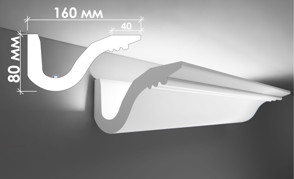 Тс‑38 (Т‑336) — спеціалізований гіпсовий карниз для скритого освітлення висотою 80 мм та шириною 160 мм, розроблений для встроєного монтажу світлодіодних ламп та сучасних систем освітлення з плавною, архітектурно витончаною конструкцією. Його архітектурний, функціональний профіль з прихованою порожниною та плавним, хвилеподібним закруглениям для світильників створює архітектурно витончаний ефект, надаючи інтер'єру елегантності, технологічної утонченості та архітектурної динамічності.
