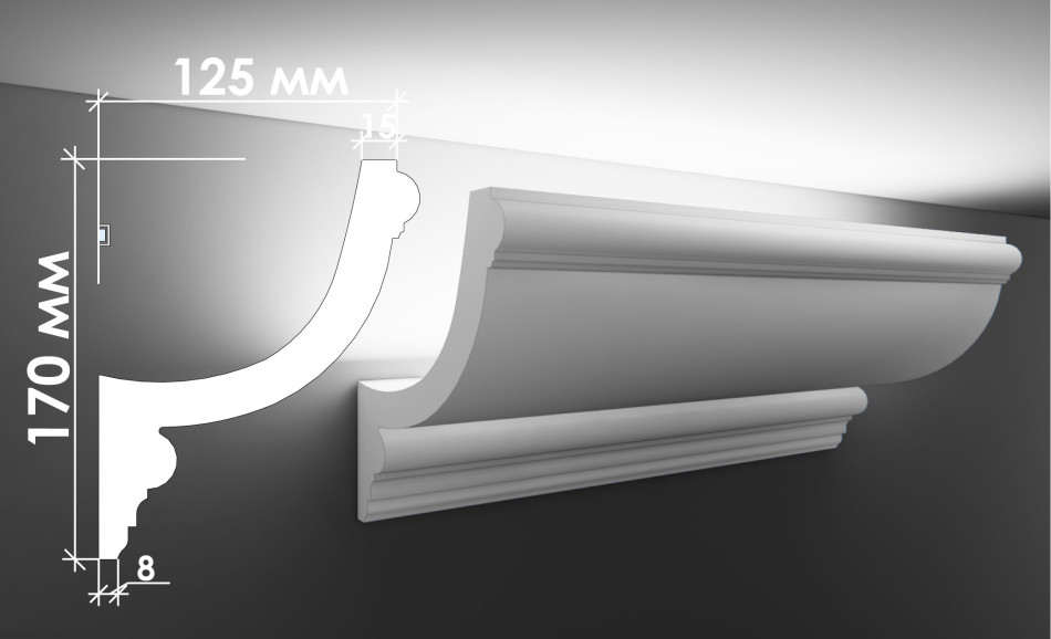 Тс‑44 (Т‑349) — спеціалізований гіпсовий карниз для скритого освітлення висотою 170 мм та шириною 125 мм, розроблений для встроєного монтажу світлодіодних ламп та сучасних систем освітлення з монументальною, архітектурно вражаючою конструкцією. Його архітектурний, функціональний профіль з прихованою порожниною та монументальним закруглениям для світильників створює архітектурно вражаючий ефект, надаючи інтер'єру елегантності, технологічної утонченості та архітектурної грандіозності.