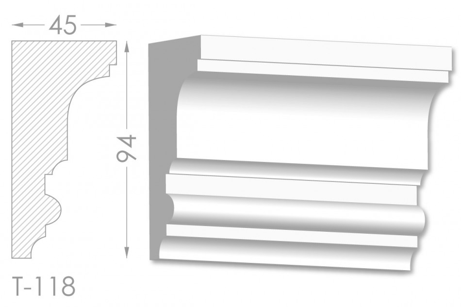 Молдинг – (Тяга) - універсальний декоративний елемент з гіпсу, оригінальної форми, який використовується для кріплення на вертикальну площину. Виріб призначений для декорування внутрішніх стін приміщень. Мета-створення особливого візуального ефекту, зонування стельової області, верхньої частини стін, завершення дизайнерського інтер'єру, внесення «останніх штрихів». Конструкція виконана з якісних матеріалів, колір – білий, відповідний кольору сировини. Молдинг може бути декорований відповідно до обраної колірної гами стилем, пофарбований в необхідний відтінок. Параметри виробу: висота – 94 мм, ширина – 45 мм.