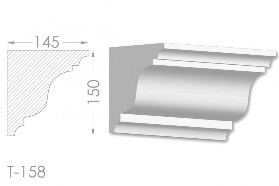 Молдинг – (Тяга) - універсальний декоративний елемент з гіпсу, оригінальної форми, який використовується для кріплення на вертикальну площину. Виріб призначений для декорування внутрішніх стін приміщень. Мета-створення особливого візуального ефекту, зонування стельової області, верхньої частини стін, завершення дизайнерського інтер'єру, внесення «останніх штрихів». Конструкція виконана з якісних матеріалів, колір – білий, відповідний кольору сировини. Молдинг може бути декорований відповідно до обраної колірної гами стилем, пофарбованим в необхідний відтінок. Параметри виробу: висота – 150 мм, ширина – 145 мм.