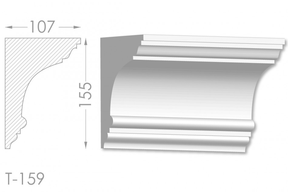 Молдинг – (Тяга) - універсальний декоративний елемент з гіпсу, оригінальної форми, який використовується для кріплення на вертикальну площину. Виріб призначений для декорування внутрішніх стін приміщень. Мета-створення особливого візуального ефекту, зонування стельової області, верхньої частини стін, завершення дизайнерського інтер'єру, внесення «останніх штрихів». Конструкція виконана з якісних матеріалів, колір – білий, відповідний кольору сировини. Молдинг може бути декорований відповідно до обраної колірної гами стилем, пофарбованим в необхідний відтінок. Параметри виробу: висота –155 мм, ширина – 107 мм.