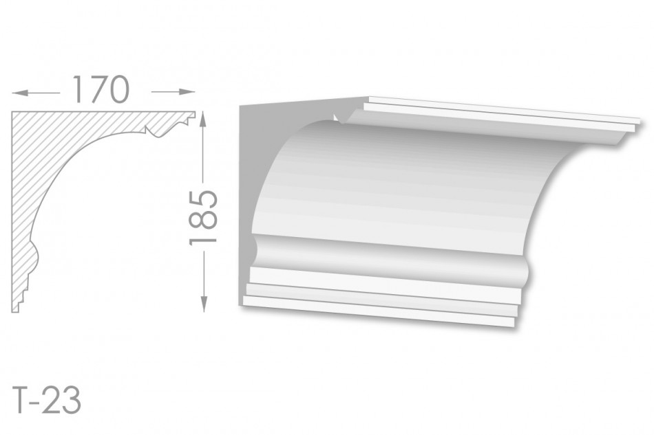 Молдинг – (Тяга) - універсальний декоративний елемент з гіпсу, оригінальної форми, який використовується для кріплення на вертикальну площину. Виріб призначений для декорування внутрішніх стін приміщень. Мета-створення особливого візуального ефекту, зонування стельової області, верхньої частини стін, завершення дизайнерського інтер'єру, внесення «останніх штрихів». Конструкція виконана з якісних матеріалів, колір – білий, відповідний кольору сировини. Молдинг може бути декорований відповідно до обраної колірної гами стилем, пофарбованим в необхідний відтінок. Параметри виробу: висота – 185 мм, ширина – 170 мм.